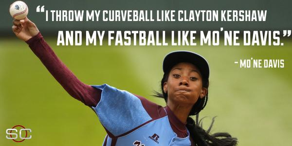 Those words, spoken by the Anderson (Philadelphia, PA) Monarchs pitcher, came deliberate and direct to reporters. Her hair flies over her left arm while the right uncorks fastballs at 70 mph, faster than her male counterparts expect, given her slight, 85-pound frame, to be sure. How awesome are the quotes? How awesome is that glare of hers under that blue cap? How oblivious does she seem to the fact that she’s only the 17th girl to compete in the Finals in the 68-year history of the Little League World Series? Super awesome.